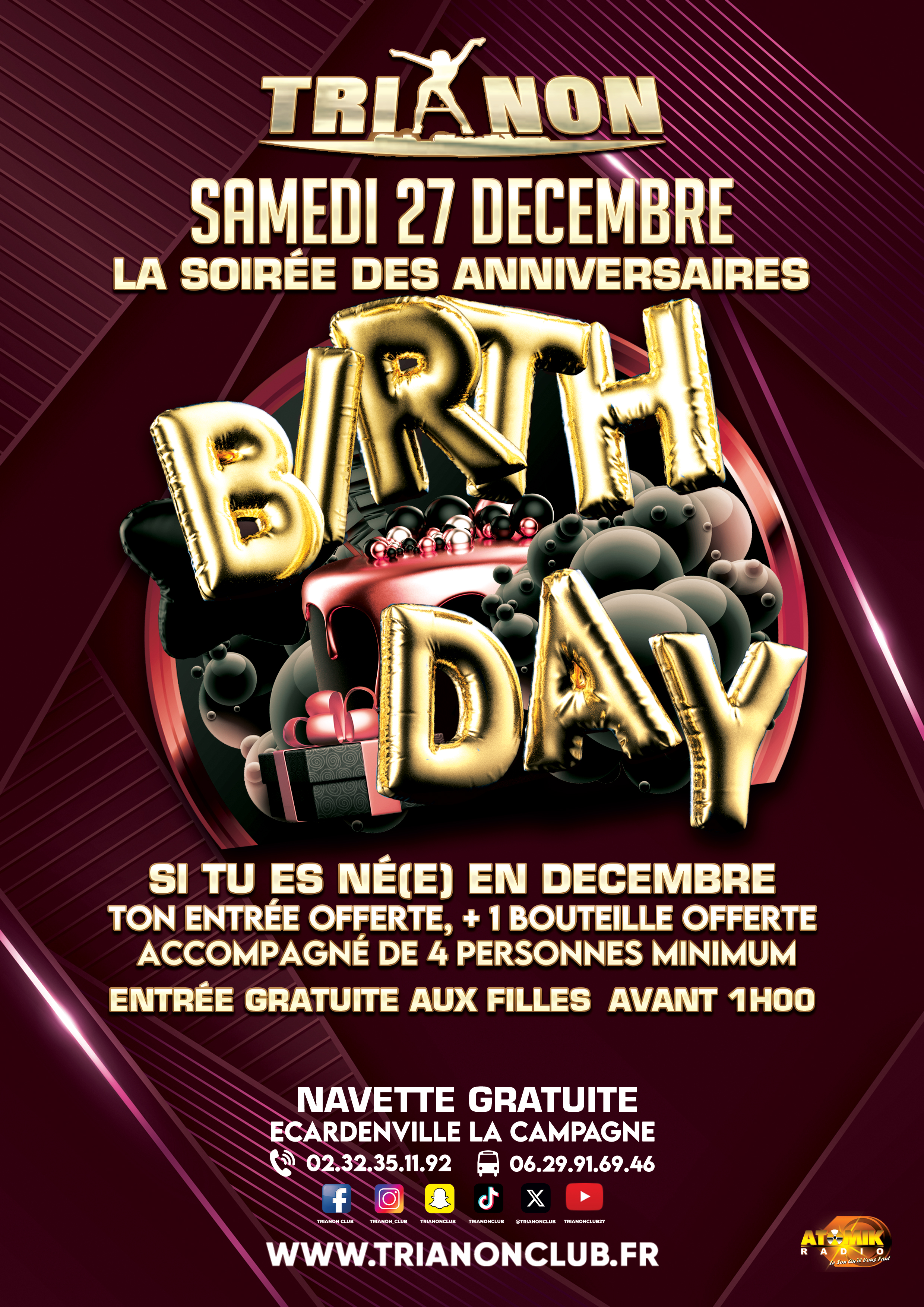Si tu est née en Décembre, ton entrée offerte + 1 Bouteille offerte accompagné de 4 personnes minimum ATTENTION !! C'est la soirée à ne pas MANQUER au TRIANON !!